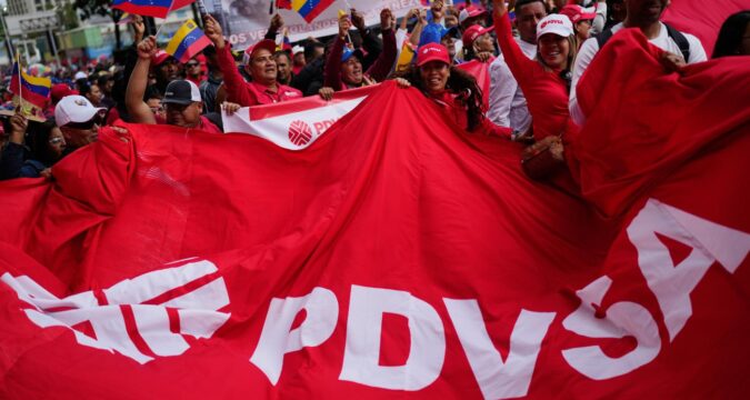 Oil workers dressed in red jumpsuits and hard hats celebrated the bill’s approval, waving a Venezuelan flag inside the legislative palace and then joining lawmakers to a demonstration with ruling-party supporters.