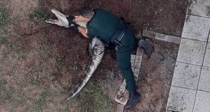 The pair then transport it and load it into the rear seat of a sheriff’s office SUV followed by celebratory fist bumps with some neighborhood onlookers.