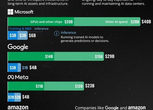 This graphic, via Visual Capitalist’s Kayla Zhu, visualizes the total AI capital expenditures and data center operating costs for Microsoft, Google, Meta, and Amazon from January to August 2024.