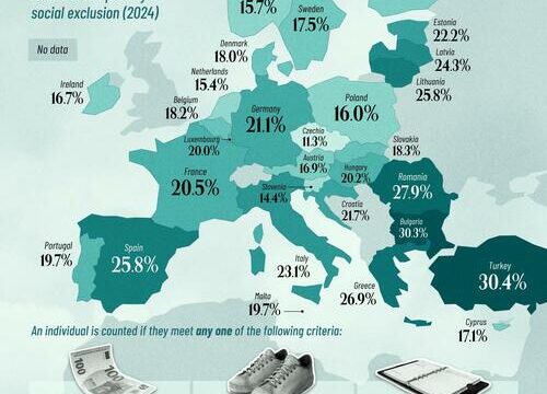 The map below, via Visual Capitalist’s Pallavi Rao, spotlights Europe’s poverty rates in 2024, measured by the share of people at risk of poverty or social exclusion in each country.