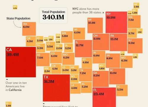This graphic, via Visual Capitalist’s Pallavi Rao, reimagines the usual U.S. map with the states resized based on their populations. Data is from the Census Bureau, as of 2024.