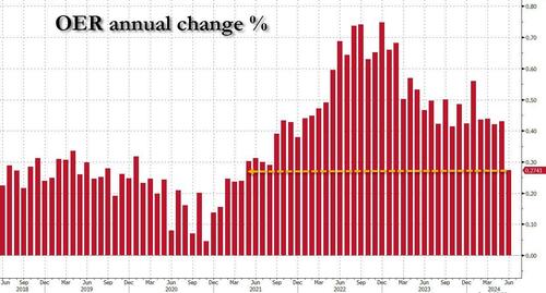 According to UBS, this is a notable help for the FOMC in their quest to move inflation sustainably back to 2 percent. The Swiss bank agrees with what we have been saying for months, namely that “OER rose 43 and 42 bps in the preceding two months and had seen a notable stalling out of progress in slowing since last year. It is also a component where Chair Powell noted he expected slowing as far back as his 2022 Brookings speech where he outlined the buckets of inflation.” The bank also noted that “if OER was going to remain as sticky as it had appeared, given the weight even in PCE prices, the FOMC would have little chance of getting inflation back to 2 percent.” The rub, of course, is that real-time trackers of rental inflation are already rising, and as we warned in April, by the time the Fed is cutting rates to reverse the slide in OER (and its 12-18 month lag) rents will be already on their way up, assuring an perfect storm of easier conditions just as housing costs soar to all time highs.
