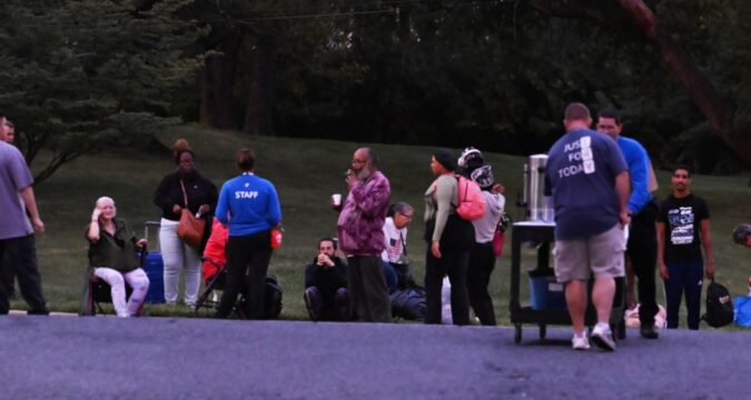 People stand in line to enter the YMCA warming station Monday, Sept. 29, 2025, in Allentown, during the first night of service.