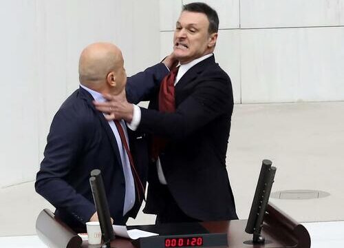 The attack quickly turned into a full-fledged brawl that lasted 30 minutes and led to the suspension of the hearing. When the session eventually resumed three hours later, MPs voted to uphold Atalay’s suspension.