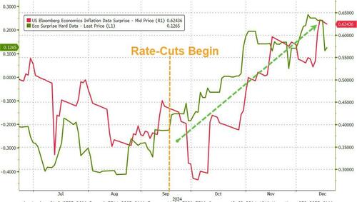 How is Fed Chair Powell going to explain why The Fed just cut rates AGAIN, despite inflation and growth (hard data) surprising dramatically to the upside? (with one dissent seeing sense and urging no cuts).