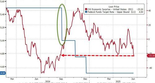 In fact, Powell may have to explain why he cut rates by 50bps the last time the US Macro Surprise Index was this weak…
