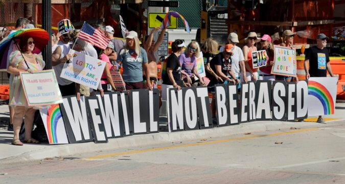 “We Won’t Be Erased” read giant letters in front of a rainbow painted on a street near Fort Lauderdale beach that served as the site of a protest on Saturday morning.