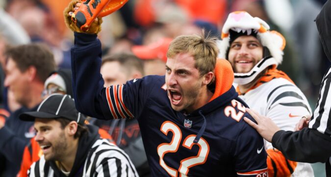 Bears safety Jonathan Owens records Bears fans celebrating after beating the Bengals 47-42 on Sunday, Nov. 2, 2025, at Paycor Stadium in Cincinnati. (Eileen T. Meslar/Chicago Tribune)
