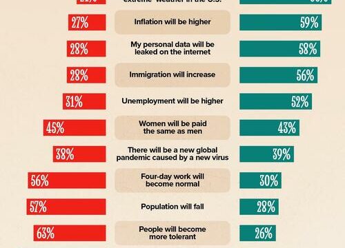 This graphic, via Visual Capitalist’s Bruno Venditti, presents predictions for 2025 on various topics, based on a survey conducted by Ipsos between October 25 and November 8, 2024, in the United States.