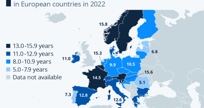 According to calculations by Statista’s Anna Fleck, Europeans could expect to have around 12 healthy years after their retirement, as of 2022 (EU-27: 11.7 years), with the average effective age of exit from the labour market 63.