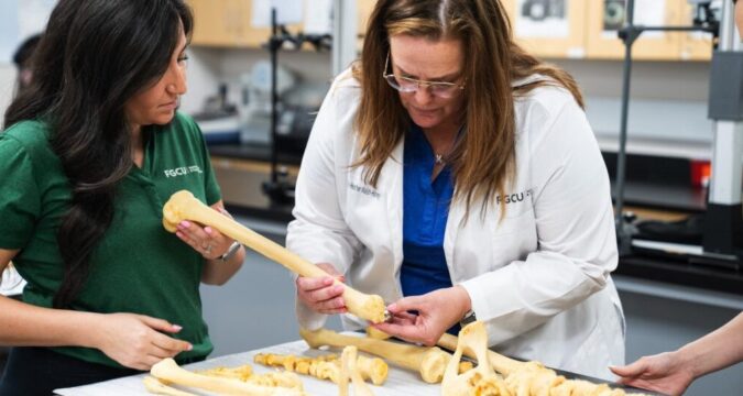 Dr. Heather Walsh-Haney at work with students. Photos depict either casts of human remains from museums and medical supply companies or donated from legal next of kin. (Courtesy/Florida Gulf Coast University)