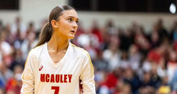 After the match, McAuley students ran onto the court, cheered and danced with the Mighty Macs’ players to “Lean On Me.” It was quite a different vibe from Sept. 18, when McAuley suffered a stunning 25-20, 25-16 loss against Loyola in Wilmette.