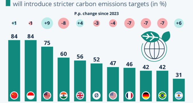 Despite this consensus, Statista’s Anna Fleck reports that it’s a more of a mixed picture when it comes to whether people think their governments will introduce more demanding targets to reduce carbon emissions in 2025.