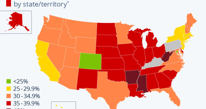 Nationally, as Statista’s Felix Richter reports, the U.S. has one of the highest obesity rates in the world, with over 40 percent of adults classified as obese.