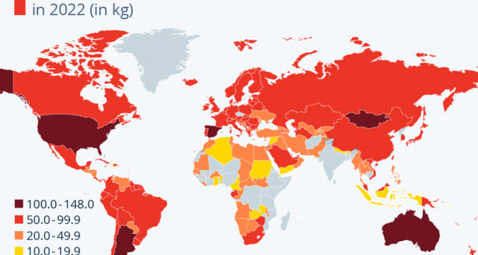 As Statista’s Katharina Buchholz details below, according to UN Food and Agriculture Organization data reported by website World Population Review, the United States, Argentina and Australia are in the top of the global meat-eating league with more than 110 kg consumed per capita in 2022.