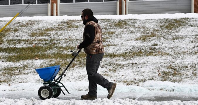 Joseph Scott spreads salt over a sidewalk Saturday, Dec. 27, 2025, in Northampton. (Amy Shortell/The Morning Call)