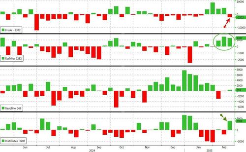 Crude stocks declined for the first time in five weeks but distillates inventories built significantly. Stocks at the all-important Cushing Hib rose for the 3rd week in a row to their highest since mid-November…