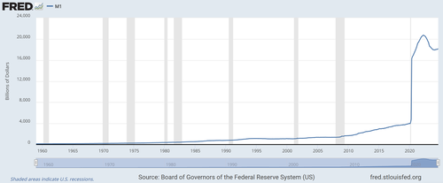The impact of the demand for handouts can be seen in the amount of money in circulation (M1 money supply). The chart shows the impact of printing trillions and trillions of dollars during 2020. The amount of dollars circulating in the banking system grew from $4 trillion to over $20 trillion in a two-year span.