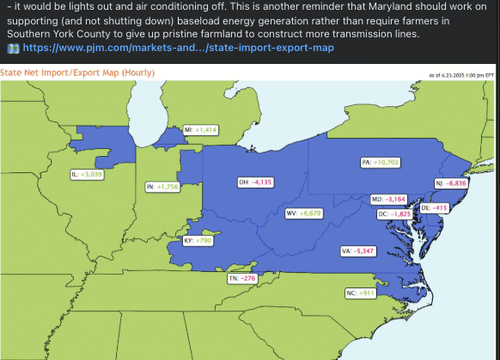 She said, “During this heat wave, Maryland consumers demand a lot more energy than it generates. If it was not for Pennsylvania – it would be lights out and air conditioning off,” adding, “This is another reminder that Maryland should work on supporting (and not shutting down) baseload energy generation rather than require farmers in Southern York County to give up pristine farmland to construct more transmission lines.”