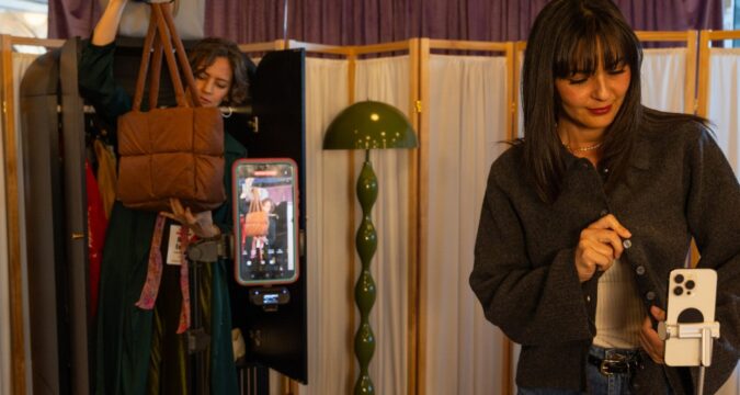 YouTube content creator Diana Extein displays her shoes to her phone camera during YouTube’s Holiday House shopping event at Google Spruce Goose on Thursday, Oct. 16, 2025, in Playa Vista, California. Extein makes fashion content for women over 40 on her YouTube channel. (Juliana Yamada/Los Angeles Times/TNS)
